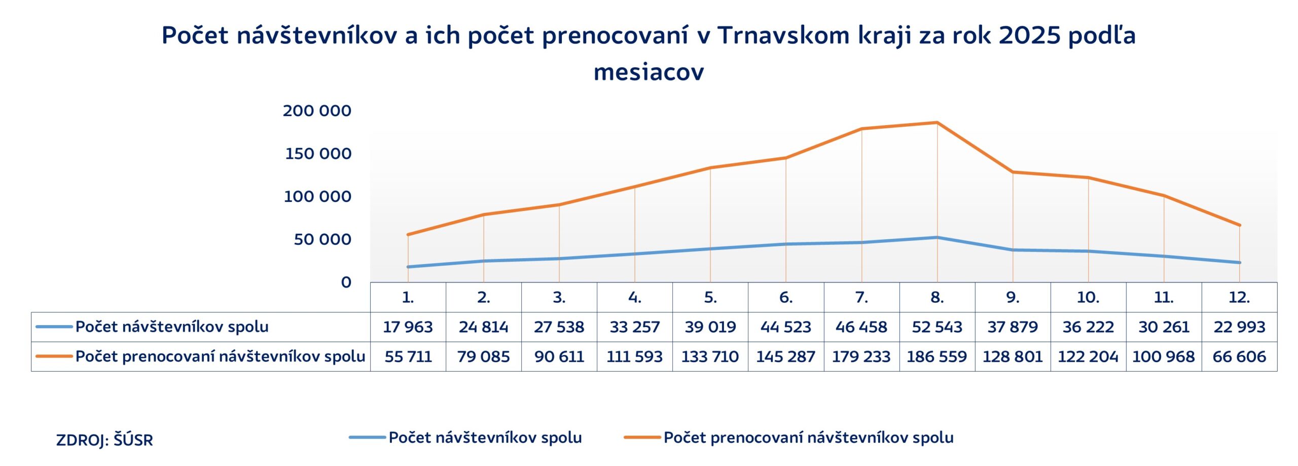 Údaje za rok 2025 ukazujú pozitívny trend v domácom aj zahraničnom cestovnom ruchu. Návštevnosť Trnavského kraja aj počet prenocovaní v ubytovacích zariadeniach na jeho území podľa údajov Štatistického úradu SR medziročne rástli, čím sa cestovný ruch v Trnavskom kraji priblížil k rekordom z roka 2019.